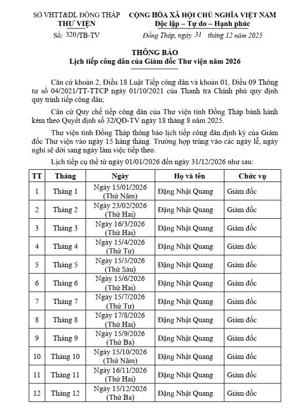 Thông báo Lịch tiếp công dân định kỳ năm 2026 của Giám đốc Thư viện tỉnh Đồng Tháp